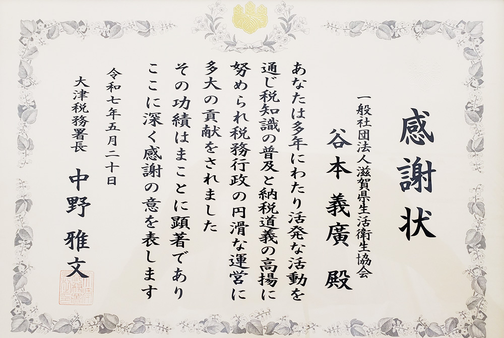 大津税務署長より当協会の谷本事務局長が感謝状をいただきました